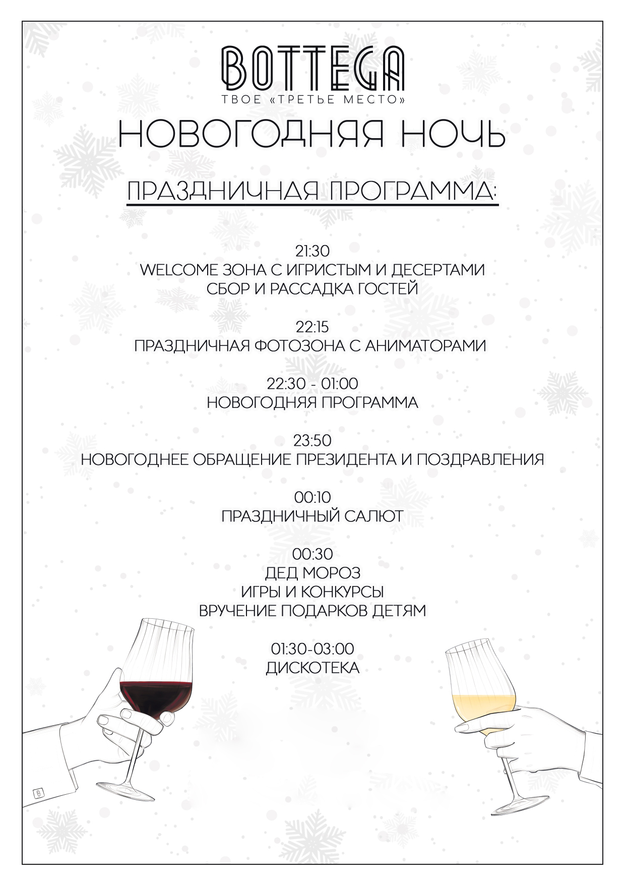 Возвращение в Петрозаводск. Обед. Размещение в гостинице. Свободное время. Вечером - участие в Новогоднем банкете в гостинице Тайвас (по желанию за доп. плату)*. Встретим новый 2026 год в незабываемой праздничной атмосфере! Для Вас этим вечером: зажигательная шоу-программа с профессиональным ведущим Юрием Бондаренко, шоу оперных певцов "Grand Аmore", выступление фокусника-иллюзиониста Дмитрия Антонова, чьи трюки заставят поверить в чудеса и увидеть невозможное! Поздравление дедушки Мороза и Снегурочки! Зажигательная дискотека в сопровождении DJ подарит самые яркие эмоции, а запечатлеть их помогут помогут стильные фото от "Инсталаб". С программой банкета можно ознакомиться здесь. Меню будет опубликовано позднее. ВАЖНО: В стоимость банкета входит приветственный бокал игристого вина и бутылка алкоголя из предложенного ассортимента на выбор. При желании можно принести дополнительные алкогольные напитки с собой (пробкового сбора нет) или приобрести их на месте.